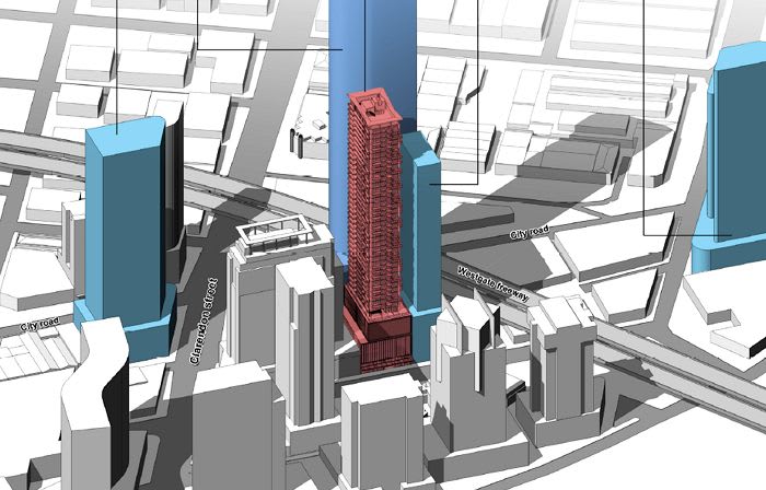 City of Melbourne's report on the initial proposal states a preferred height limit of 100 metres exists for the immediate area, but can be set aside under certain urban design parameters including providing an appropriate height transition to development in adjoining areas to the south, west and east.