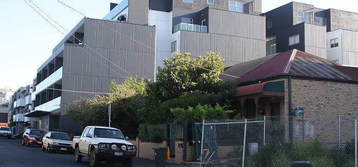 Enter the current eastern side of Breese Street (below right). The sum of the whole seems to be a far worse outcome than what each development brings in isolation. No setbacks, narrow footpaths, wide roads (in parts) and no street level activation - is smart urban design present here?