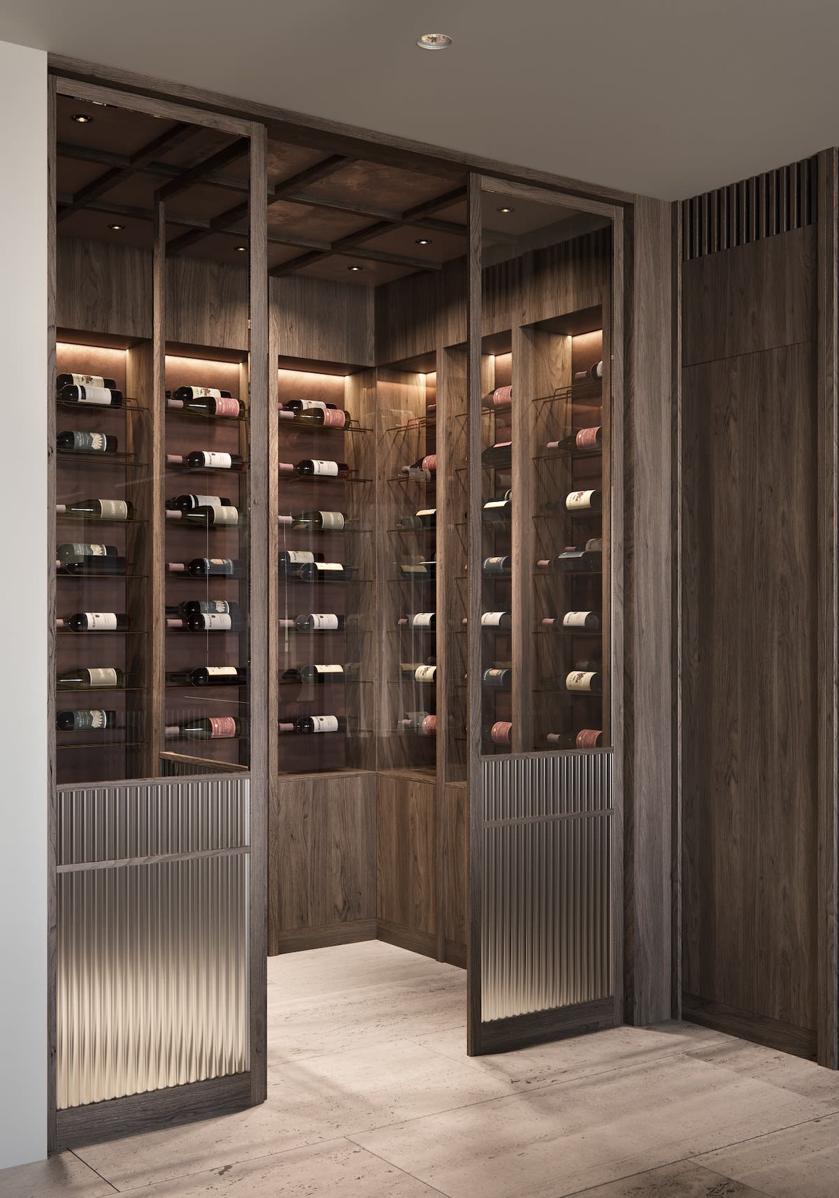 A private wine cellar adjoins the expansive entertainer’s kitchen and butler’s pantry, finished in natural stone bench tops, custom joinery and a choice of either timber or travertine floors.