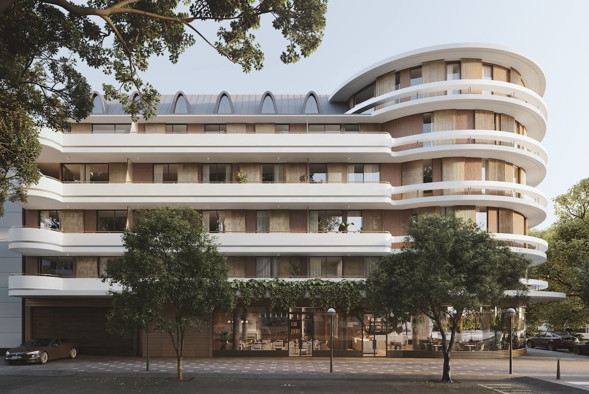 The five-storey development, designed by Luigi Rosselli Architects, comprises 15 three and four-bedroom apartments and 600 sqm of ground floor retail space, most of which has been sold to leading Sydney restaurateurs.