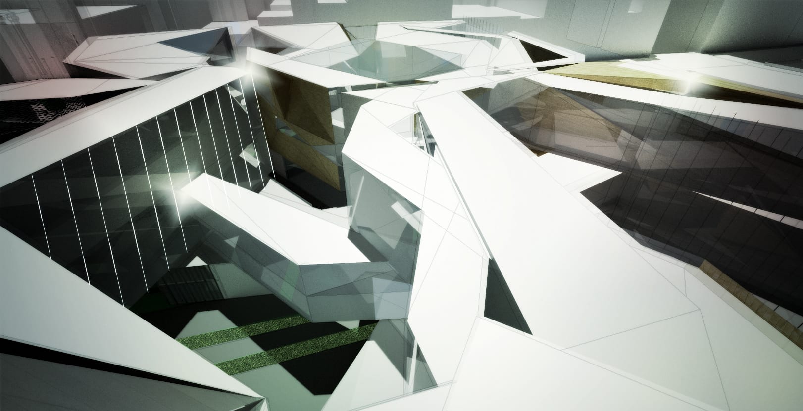 The first concept was part of a design studio entitled FX-TENSION and was run very similar to a design ideas competition so the level of resolution at a micro scale wasn't as critical as the macro planning. The brief was to develop a proposal for a building or series of buildings which would bring together the three schools of architecture (at the time - Monash has since joined) under one roof, as well as an extension to the NGV's Ian Potter Centre housing the Oceania and Asia collections.