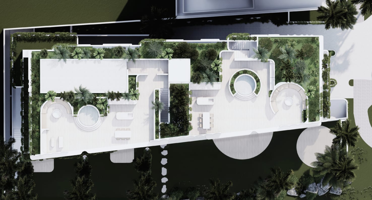 It is crowned by two two-level penthouses, each with a rooftop terrace with a spa, firepit, and outdoor kitchen and dining area.