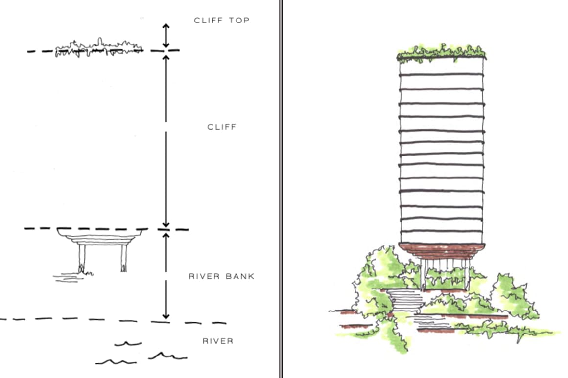 Plus Architecture broke the design concept down into four sections; the cliff top, the cliff, the riverbank, and the river.