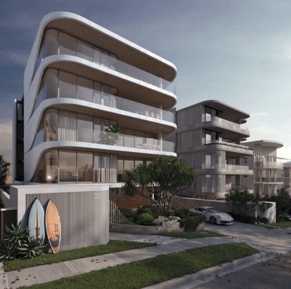 Render of the proposed Moffat Beach apartments at 20 Queen of Colonies Parade. Credit: Joe Adsett Architects