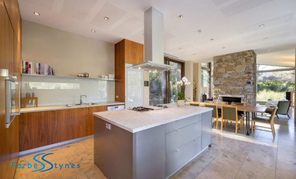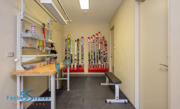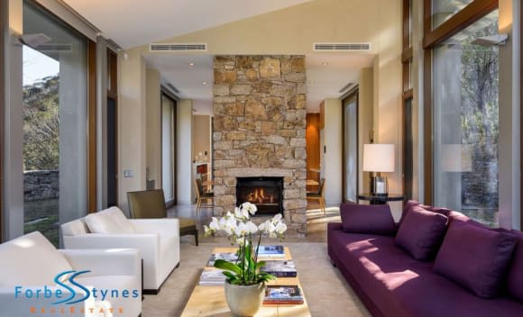 The two-storey, five bedroom residence features remote-controlled 15 zone underfloor heating, plus floor-to-ceiling windows looking out on snow gums and passing skiers.