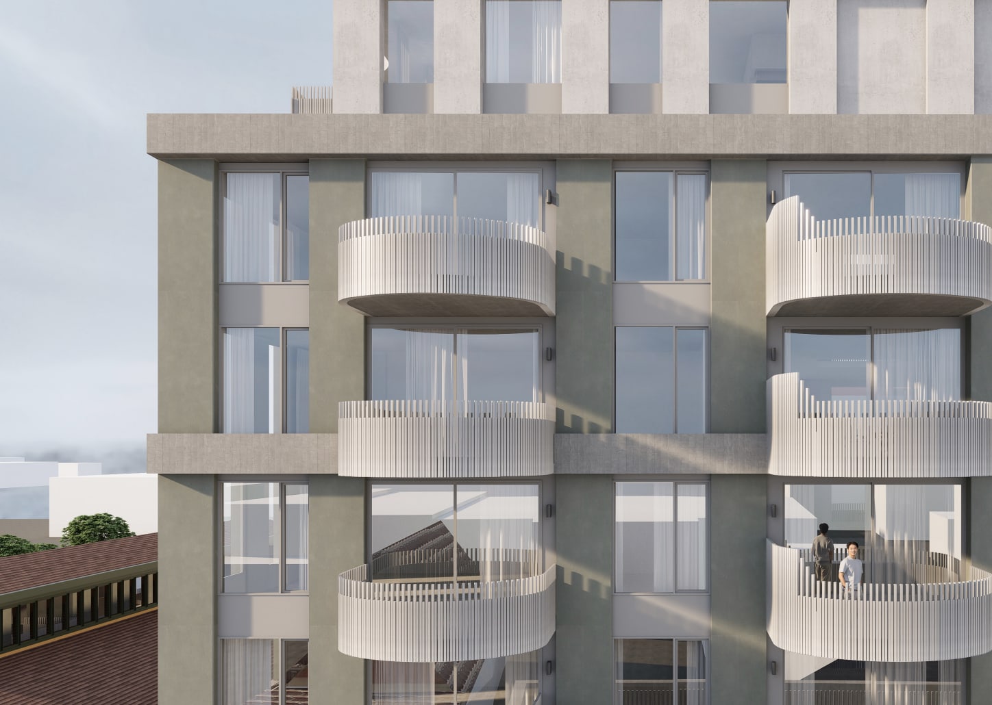 "Informed by neighbouring arched windows, a curved language is introduced to canopies, floor plate edges and parapets. This language is then exaggerated with introduction of semi-circular protruding balconies contrasting with the building’s otherwise rational façade."